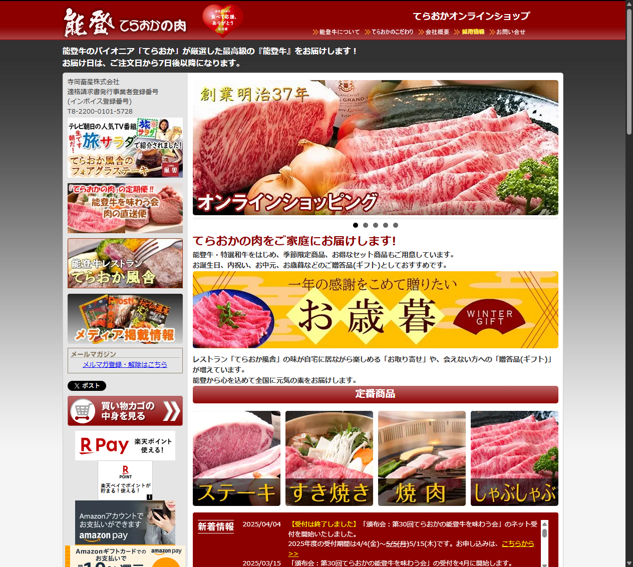 【てらおかの能登牛】創業明治37年(1904年)、能登の肉屋の「てらおか」です。石川県が誇る銘柄牛(ブランド牛)の「能登牛(黒毛和牛)」をはじめ、厳選した和牛、国産牛、能登豚などを直送いたします。能登牛は、年間出荷頭数が極めて少なく「幻しの牛」ともいわれており、肉質も良く、とろけるような霜降りの旨みが特徴です。お中元、お歳暮、ご結婚やご出産のお祝い・内祝いなどギフト商品(ご贈答用)としてもおすすめです。