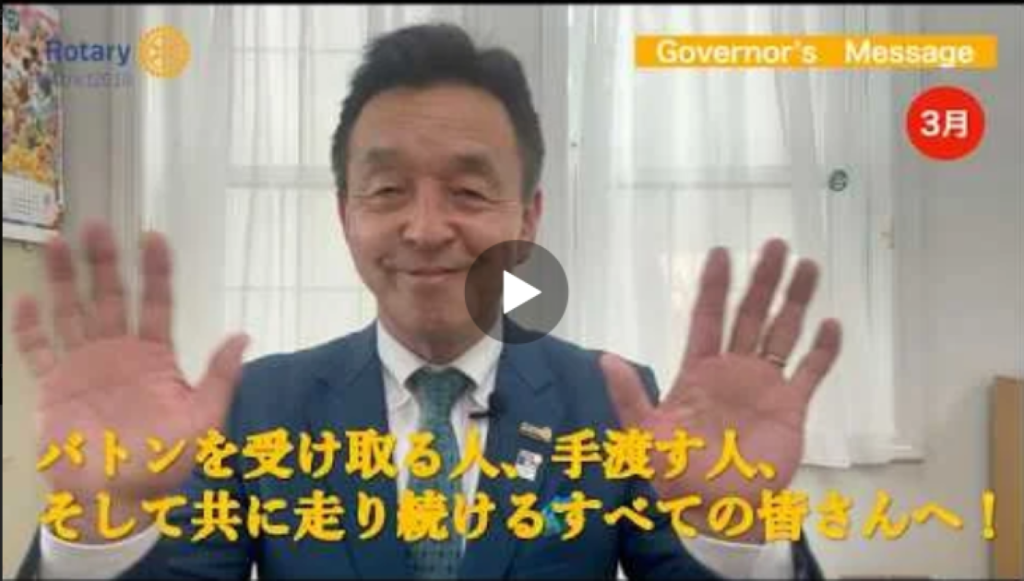 お知らせ(すべて)お知らせ【動画】ガバナーメッセージ2026年3月号 【動画】ガバナーメッセージ2026年3月号 2026/03/09 2026年3月号のガバナーメッセージを地区YouTubeチャンネルで配信しております。是非、チャンネル登録と高評価をお願いします! でシェア でシェア でシェア でシェア